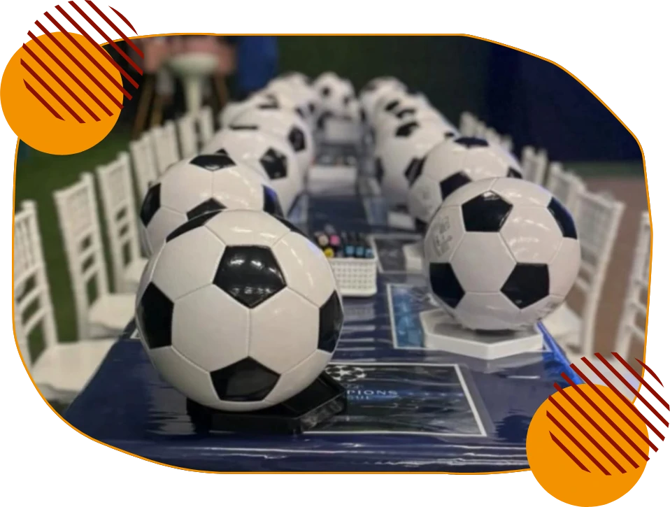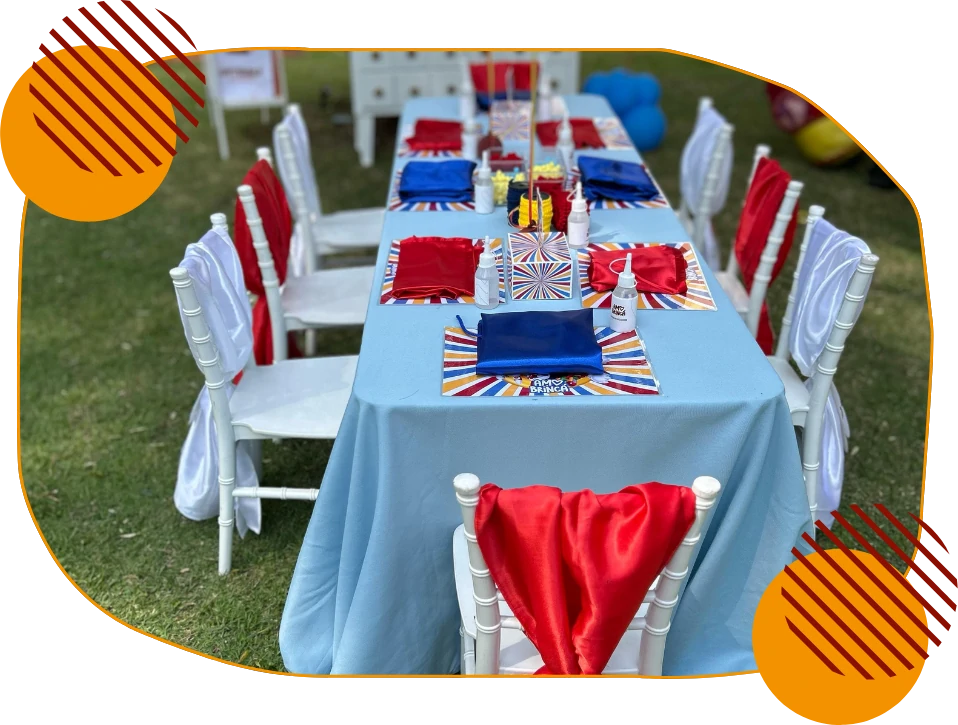 Mesa com balões no tom da festa e jogo americano no tema