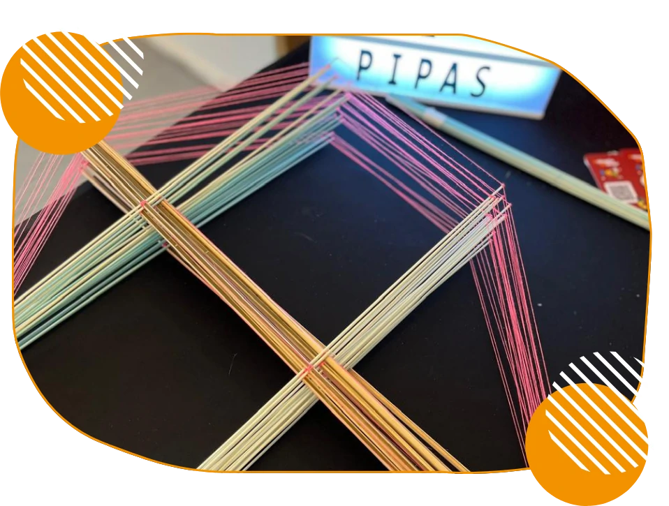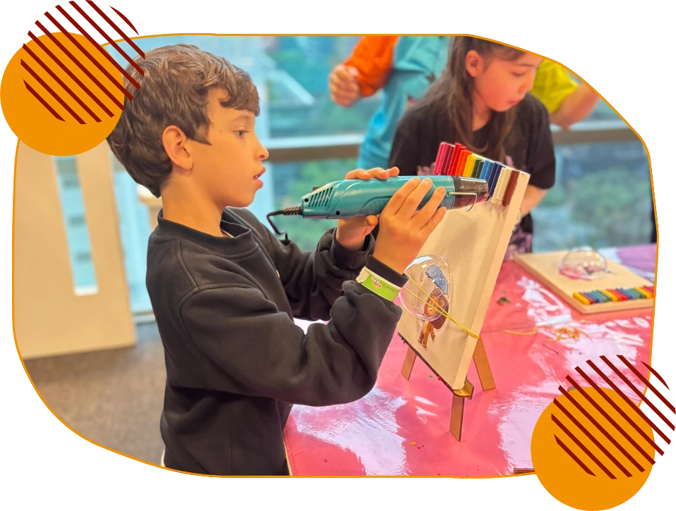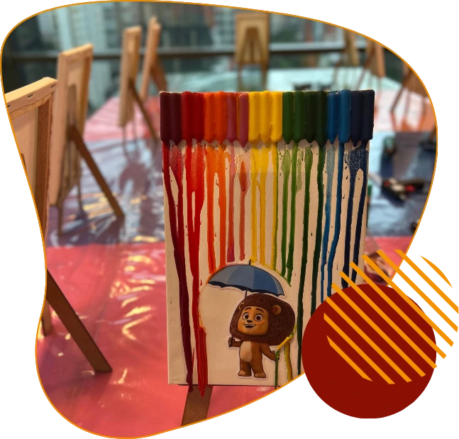 As crianças utilizam giz de cera aquecido para criar composições em tela, papel ou madeira, explorando o movimento da cera derretida que escorre e se mistura em cores vibrantes e texturas únicas.