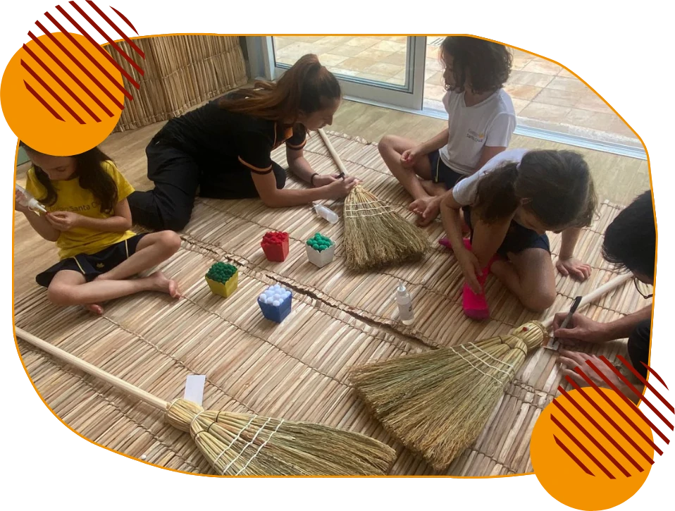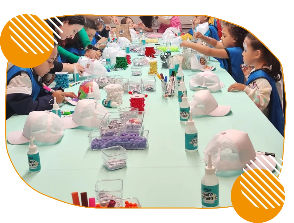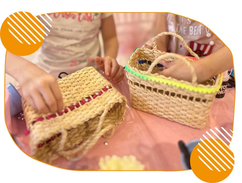 Com um toque de delicadeza e estilo, as crianças customizam bolsinhas de palha com apliques, fitas, nomes e pequenos adornos que refletem sua identidade.
